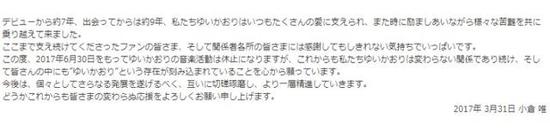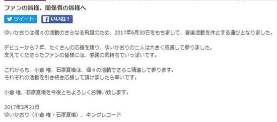 昨天下午,唯夏织组合的官方网站突然发表了解散的公告,公告中称:“为了能让唯夏织的成员更好地各自活动,2017年6月30日起,组合将停止音乐活动。组合出道至今已有7年,大家给予的支持让唯夏织的两人得到了很大的成长。对于支持我们的各位粉丝,我们充满了感谢之情。今后小仓唯、石原夏织将继续各自单独活动,大家能够继续支持我们的各类活动的话,我们会非常幸福。”
