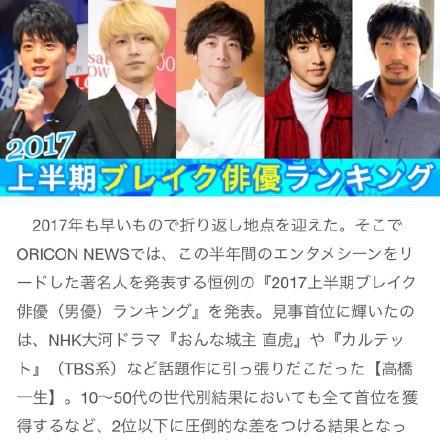 Oricon(日本公信榜)是由1968年1月4日正式开始举办的日本最具知名度的音乐排行榜。能登上各种排行榜榜首,对于艺人们而言算是一件非常有意义的事情。最近Oricon发表了“上半期大热演员排名”,其中高桥一生获得了各年龄层票选人气首位。