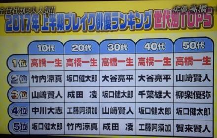 在这次Oricon上半期大热演员排名中,一共有5类年龄段的网友参与了投票。竹内凉真、大谷亮平、柳乐优弥、山崎贤人、中川大志等艺人都上榜了,不过高桥一生却获得了各年龄层票选人气首位。对此我们就来看看网友们的看法吧。“同感,最接近50代的喜好,个人喜欢高桥一生、柳乐优弥和竹内凉真。”“不愧是我喜欢的男人。”“看到高桥一生就想起了冯巩。”“大谷亮平红的速度有点快,高桥和坂口小天使。”“高桥小哥厉害了,居然扫全榜!”