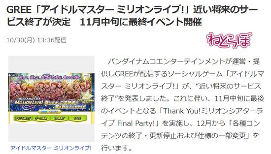 《偶像大师》系列是岛国非常著名的游戏作品,推出了《偶像大师》《灰姑娘女孩》《MILLION LIVE!》以及《Side M》这四个系列。其中《灰姑娘女孩》《MILLION LIVE!》以及《Side M》都更加侧重于手机平台,它们各自都有一款手机社交游戏(抽卡舔小姐姐)与一款APP游戏(音乐游戏)。今天《偶像大师 MILLION LIVE!》手游运营平台GREE突然宣布《偶像大师 MILLION LIVE!》于11月中旬开启的活动“Thank You! ミリオンシアターライブ Final Party!”将会是游戏最后的活动。从12月1日开始,游戏内的各项功能都将停止使用,不过准确的停服时间还没有确定。
