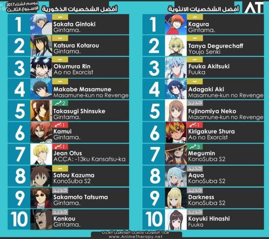 本次榜单分为男性篇和女性篇两个部分。男性方面,获得榜首的角色是《银魂》主人公坂田银时。作为一个平时吊儿郎当,关键时刻特别靠谱的角色,银时可以说是很多动漫迷心目中的大众情人了。而他可以得到阿拉伯动漫迷的喜爱,这一点也说明了真正有魅力的男人,是根本不会被所谓的国籍、文化所限制的。尤其是新系列的《银魂。》里,银时的表现更加引人关注。