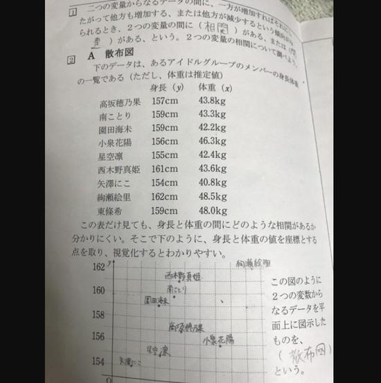 从他上传的图片上可以看到,这道题里列举了关于《LoveLive!》当中角色们的身高以及体重数据。非常有趣的是,在体重方面,题目里还专门标注是“推测数值”,看来就算是出题老师,也不可能清楚地了解到小姐姐们真实的体重吧。