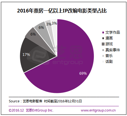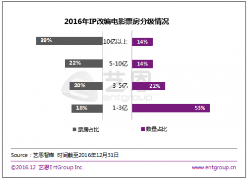 2016年,IP依然有资格成为泛娱乐行业备受热捧的主角。据艺恩电影智库数据显示,2016年过亿电影数量86部,累计创造398.24亿票房,其中IP改编电影占据37席。虽然仅占2016年全年上映电影503部的7%,但其却创造了全年35%的票房,占过亿票房电影产值的38.94%,IP改编电影的造金能力由此可见一斑。
