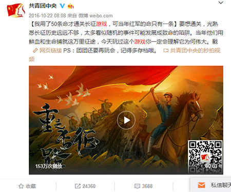 就目前来看,橙光游戏的“养鱼”工作已初见成效。据不完全统计,已经建立过的橙光游戏工程数量已经近400万个;用户发布出来的作品已经超过了50万部。而且游戏的风格类型也在逐渐丰富,除去早期的女性向作品之外,更多风格、更多类型的用户和作品不断涌现出来。目前橙光已经新开了谍战和现实题材板块,由此辐射到了更大的用户人群。甚至就连共青团中央,都利用橙光游戏工具制作了一款名为《重走长征路》的生存游戏。