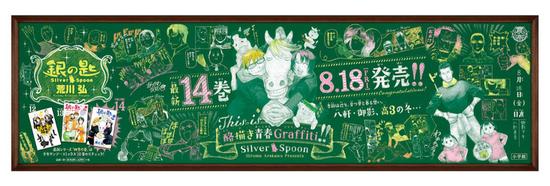 这个大型宣传画高约2米,宽约7米,再现了漫画中出现的大虾夷农业高中的黑板。八轩勇吾、御影秋等主要角色都有在上面登场,想必可以让粉丝们回忆起不少令人难忘的片断。第13卷单行本是在2015年6月发售的,为了等第14卷,粉丝们也是望穿秋水。