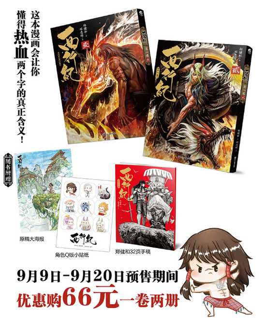 本次《西行纪》漫画实体书预售时间为9月9日~20日,一卷两册,预售价为66元,随书附送明信片、海报、贴纸和手稿册子四大赠品(其中明信片可是限量哦),粉丝们记得本周六前往天猫等各大购书平台进行预售抢购吧!手快有手慢无哦~