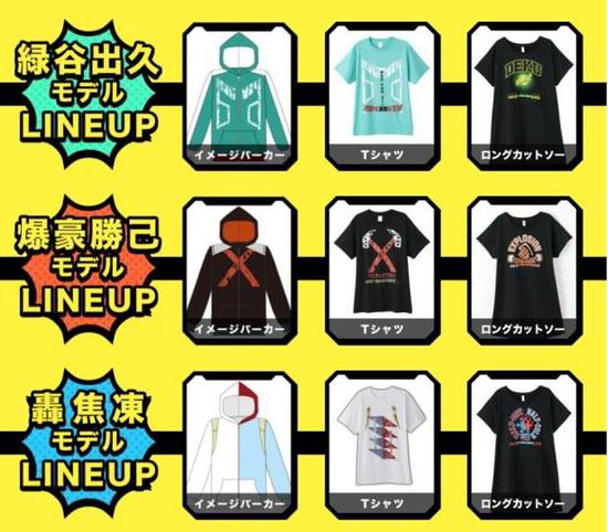 本次ACOS推出的《我的英雄学院》联动服装一共九种,绿谷出久、爆豪胜己、轰焦冻三人一人三种,分别是戴帽卫衣、T恤和长T恤,皆以三人的颜色和代表图案为主题制作。卫衣售价为8000日元(大约480人民币),T恤售价为2800日元(大约168人民币),长T恤售价为3800日元(大约228人民币)。